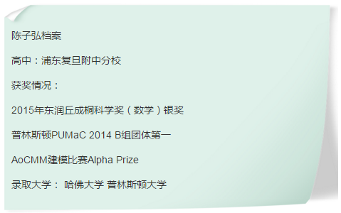小学六年级时,美国数学家撰写的《什么是数学》英文原著引领陈子弘涉足这座奇妙的科学殿堂。初中时,他开始自学高中数学;高中时,他开始自学大学数学,上普林斯顿大学网站查询课程和教材,聆听大师公开课。2014年参加普大数学竞赛(PUMaC),他所在的小组获得 B组团体第一。参加东润丘成桐科学奖的研究报告课题,也是在阅读普大教材《Fourier Analysis: an Introduction》时萌生的。对比普林斯顿大学数学竞赛和东润丘成桐科学奖,他认为:前者像奥赛,限定时间,感觉会刺激一些;后者带研究性质,没有试卷和标准答案,而是长时间做一个课题,鼓励参加者锻炼独立的思维和坚持不懈的努力,对数学能力的提高更加有效。